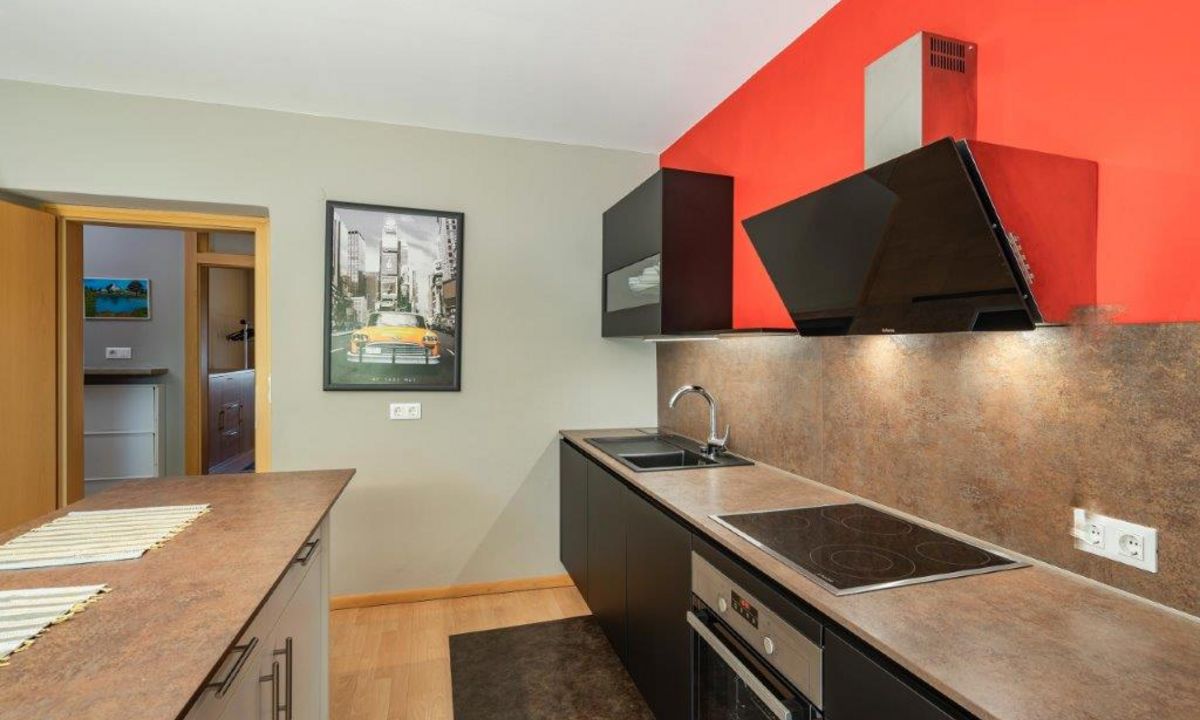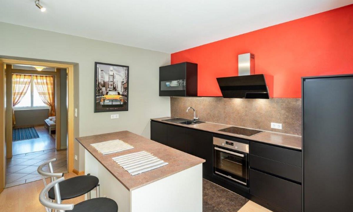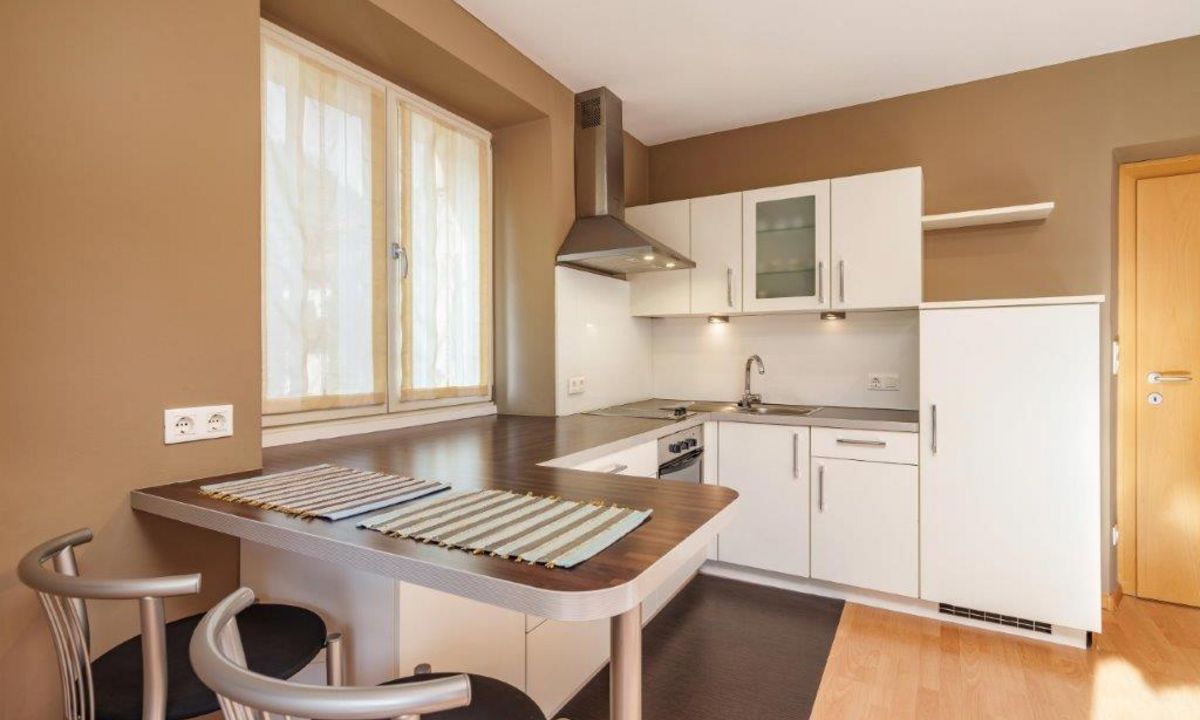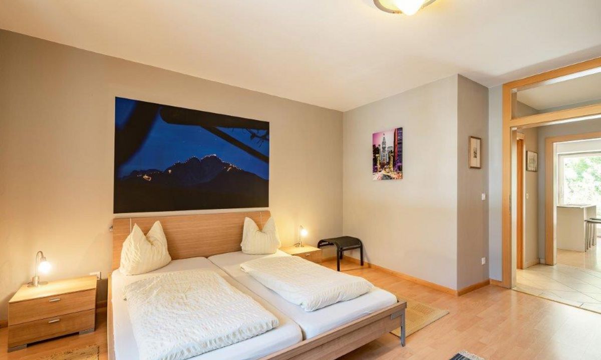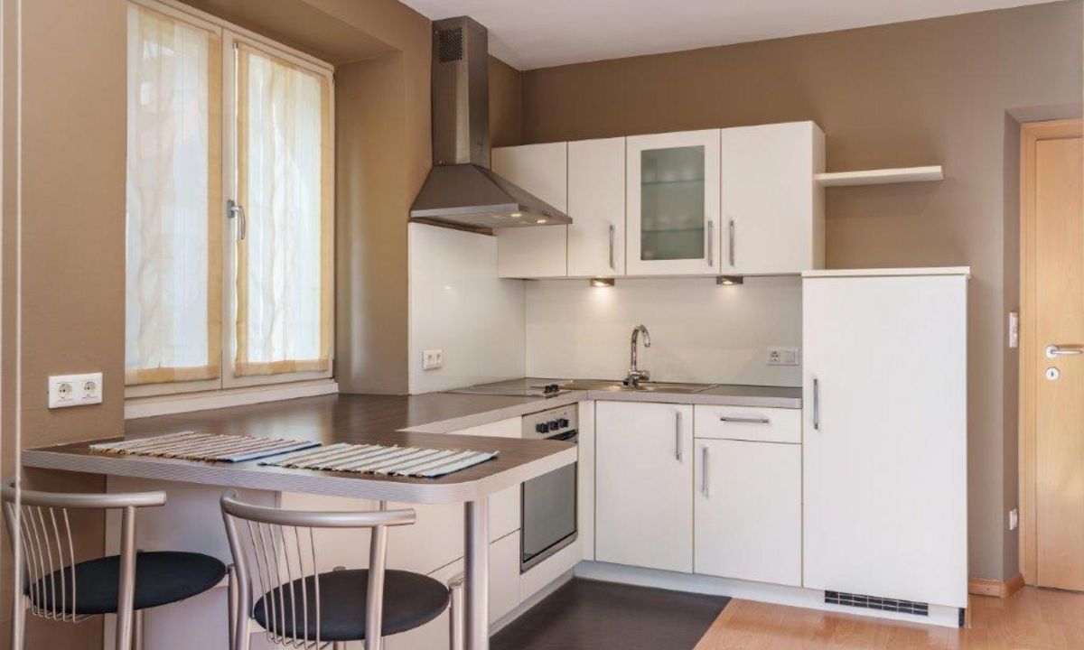 Soggiorno con cucina, bagno, 2 camere da letto separate.